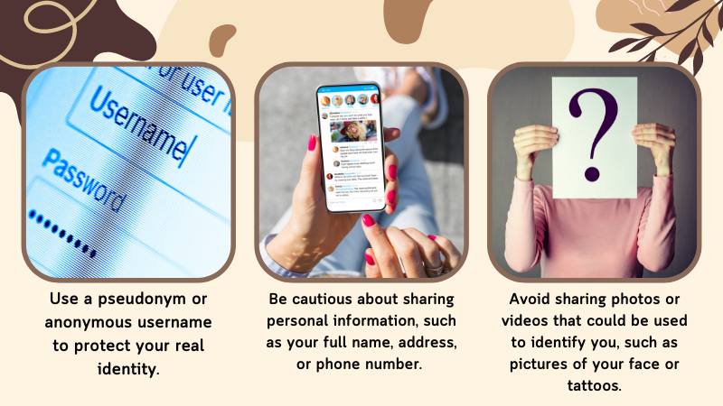 Avoid sharing photos or videos that could be used to identify you, such as pictures of your face or tattoos.