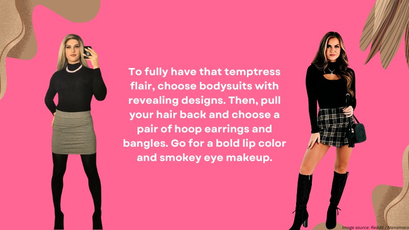 To fully have that temptress flair, choose bodysuits with revealing designs. Then, pull your hair back and choose a pair of hoop earrings and bangles.