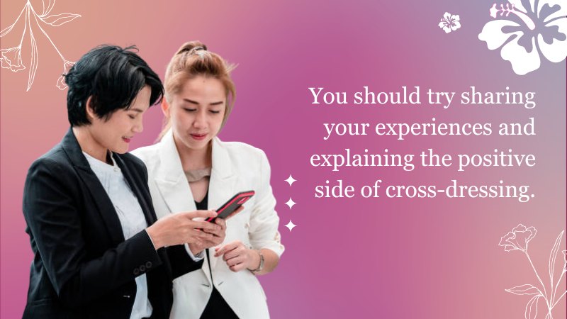 Another approach is to educate others about cross-dressing. Explain to them the emotional journey that comes with it. You should try sharing your experiences and explaining the positive side of cross-dressing. Explain the impact that it can have on your emotional well-being and identity. This way, you can help break down stigma and promote understanding and acceptance.