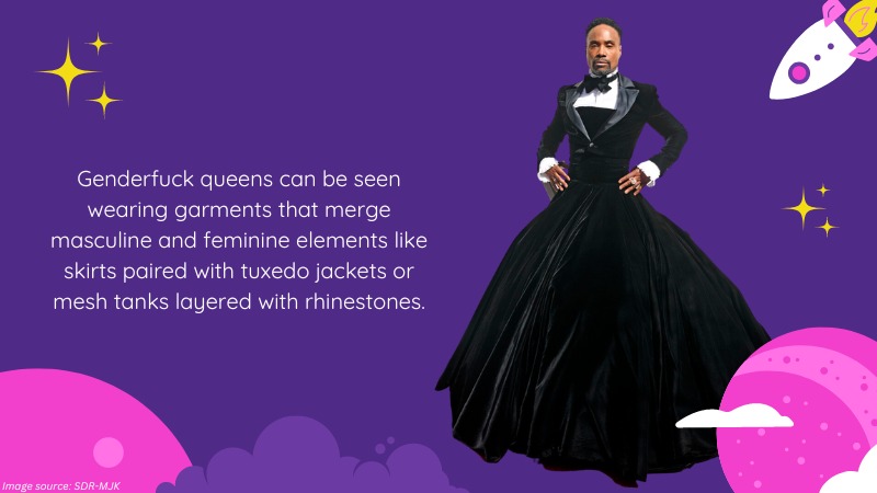 Genderfuck queens can be seen wearing garments that merge masculine and feminine elements like skirts paired with tuxedo jackets or mesh tanks layered with rhinestones.