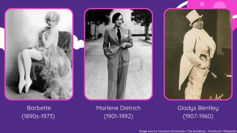Marlene Dietrich (1901-1992): Marlene Dietrich was a German actress and singer who often performed in drag. She is remembered for her iconic roles in films such as “The Blue Angel” and “Touch of Evil,” which explored gender roles and challenged social conventions.
