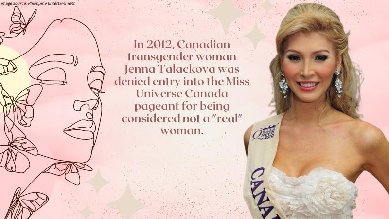 In 2012, Canadian transgender woman Jenna Talackova was denied entry into the Miss Universe Canada pageant for being considered not a “real” woman. This sparked international outrage and led to Talackova being allowed to compete in the pageant after all.