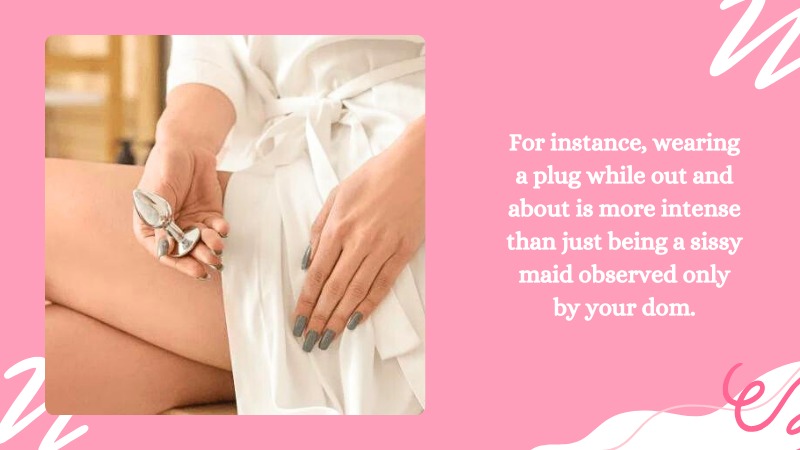 In public, there’s a heightened thrill from the fear of being discovered and humiliated. For instance, wearing a plug while out and about is more intense than just being a sissy maid observed only by your dom.