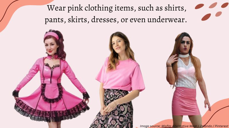 Clothing: Wear pink clothing items, such as shirts, pants, skirts, dresses, or even underwear. You can start with small pink accents and work your way up to larger items if you’re not used to wearing the color.