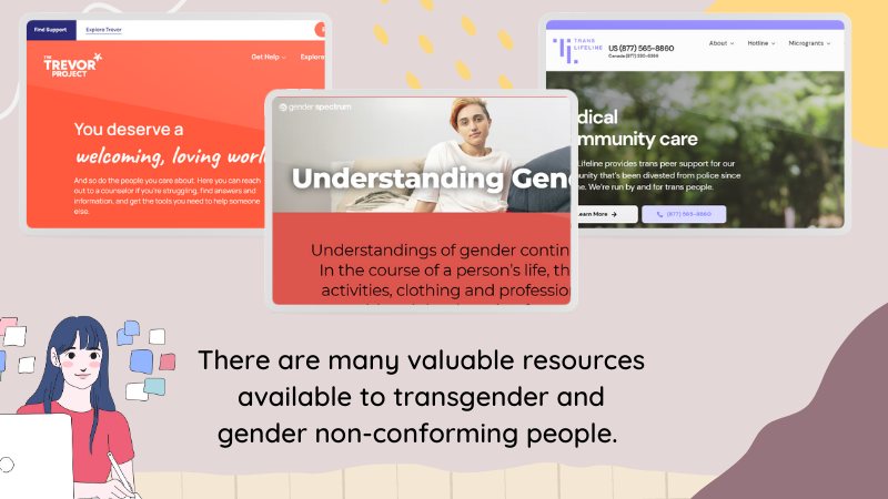There are many valuable resources available to transgender and gender non-conforming people. Here are a few that I recommend: