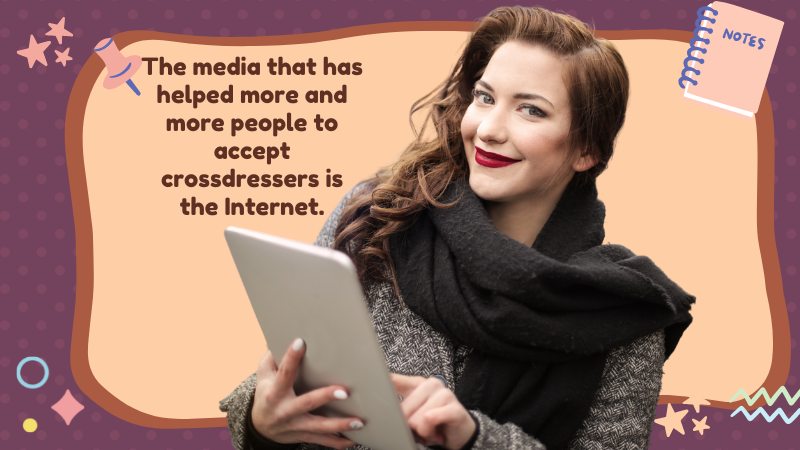 “Media” is short for “mass media”, which refers to forms of communication that deliver information and entertainment to large audiences via mass communication technologies, for example, the press, radio, television, the Internet, and movies. The media forms part of life, and how long we use the media strongly affects their perspectives and views. The media that has helped more and more people to accept crossdressers is the Internet. The internet gives crossdressers a safe space to express themselves and learn valuable information, such as where to buy clothes and accessories as well as how to transition safely.