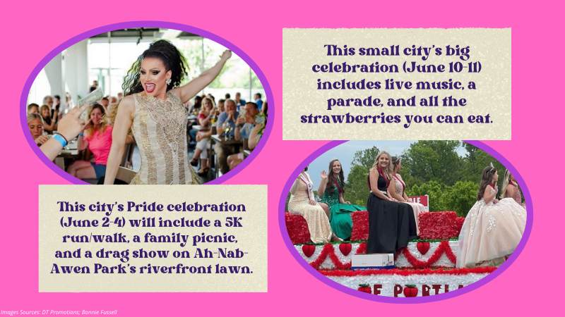 This city’s Pride celebration (June 2-4) will include a 5K run/walk, a family picnic, and a drag show on Ah-Nab-Awen Park’s riverfront lawn.