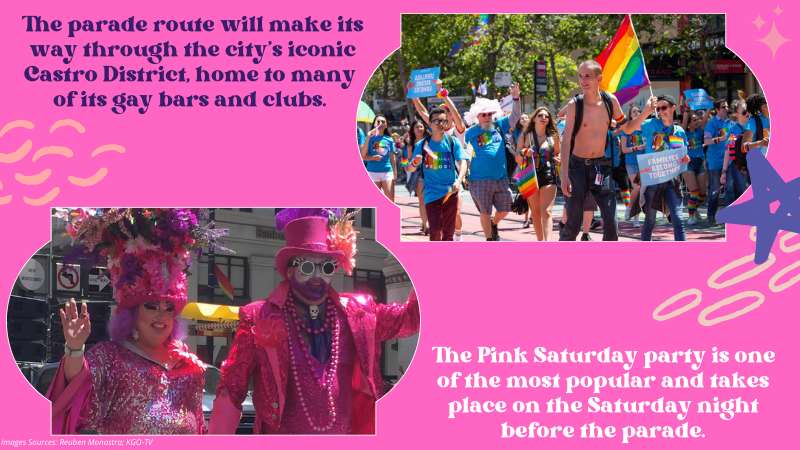 The main event during Pride Month is the annual Pride Parade, which will take place on Sunday, June 26th. The parade route starts at Market Street and ends at 8th Street, making its way through the city’s iconic Castro District– home to many of its gay bars and clubs.