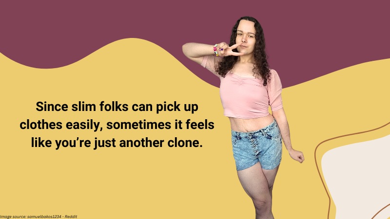 Since slim folks can pick up clothes easily, sometimes it feels like you’re just another clone. With everyone having the same fits, it’s tough to stand out.