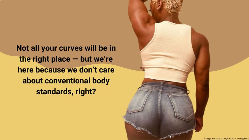 Not all your curves will be in the right place — but we’re here because we don’t care about conventional body standards, right? It’s good if you have curvy hips and rear.