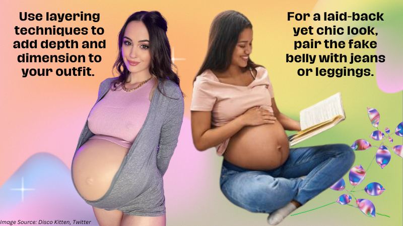 - Casual and Chic: For a laid-back yet chic look, pair the fake belly with jeans or leggings. Opt for comfortable and stretchy bottoms that can accommodate the fake belly without compromising on style. Style it with oversized sweaters, button-up shirts, or casual blouses to create a trendy and effortless ensemble.