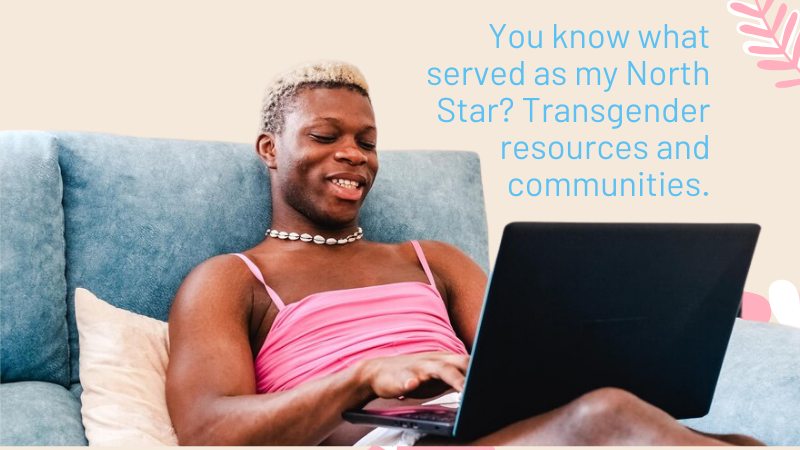It’s destructive, really. To not know who you are and how to be the real you. Even more so when you have no idea where to start. You know what served as my North Star? Trangender resources and communities. These groups gave me a map of how to navigate my confusing state.