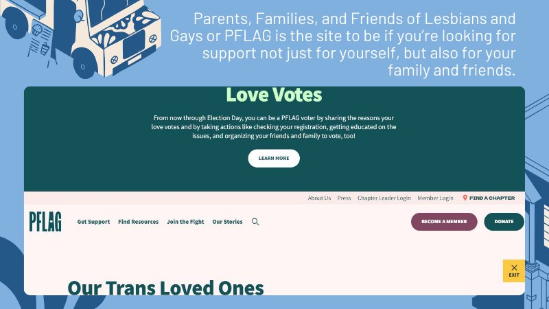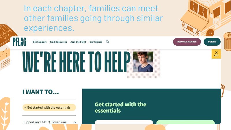 PFLAG super helpful ‘cause it’s not just about the trans individual— it’s about the whole family. It started in 1973 and now has chapters all over the country. In each chapter, families can meet other families going through similar experiences. It’s like a support network for the support network, if that makes sense.