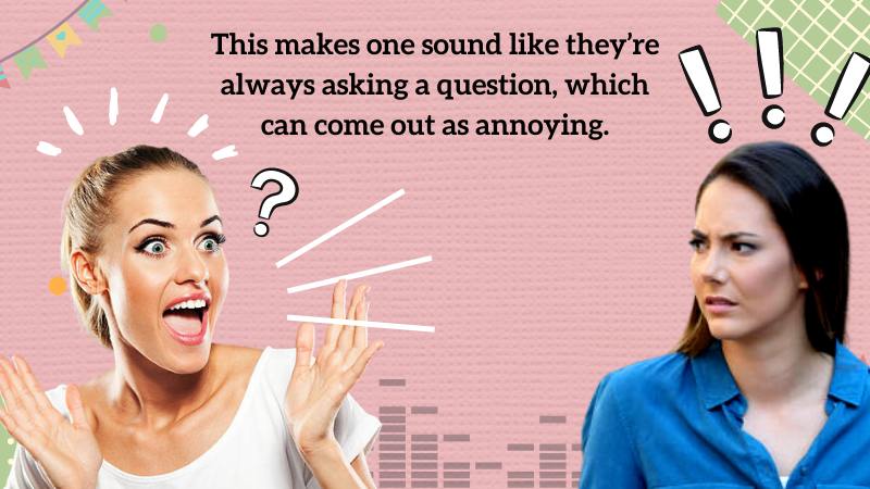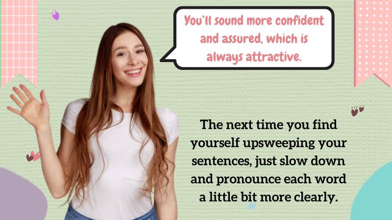 So the next time you find yourself upsweeping your sentences, just slow down and pronounce each word a little bit more clearly. You’ll sound more confident and assured, which is always attractive.