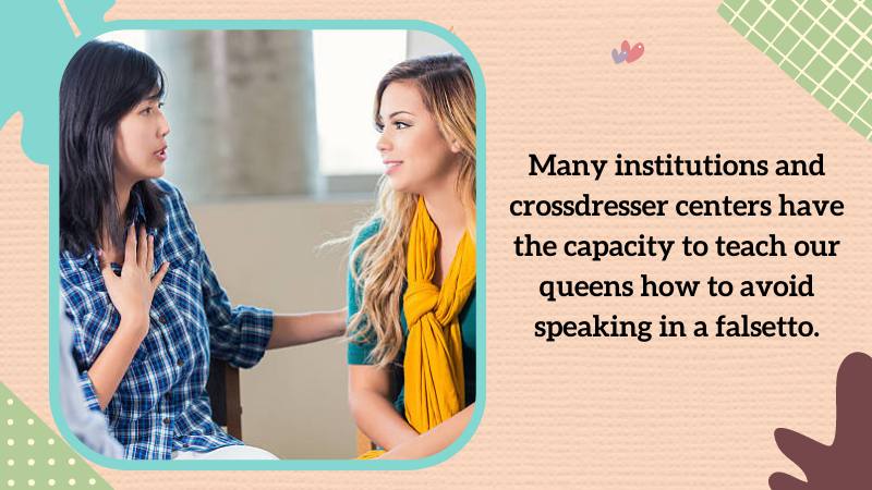Many institutions and crossdresser centers have the capacity to teach our queens how to avoid speaking in a falsetto so they can enroll to sound more like a true female. Additionally, many online articles and videos also go into great detail about how you can avoid speaking in falsetto. Searching for these resources can be a great way to help you learn more about how to feminize your voice.