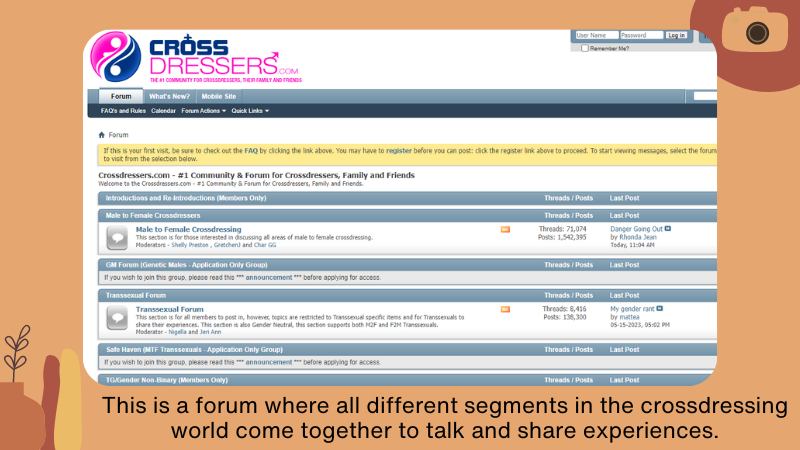This is a forum where all different segments in the crossdressing world come together to talk and share experiences. It features a variety of discussion topics, such as dating tips, advice on how to conceal your identity, and ways to succeed as a crossdresser.