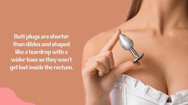 Butt plugs are shorter than dildos and shaped like a teardrop with a wider base so they won’t get lost inside the rectum.
