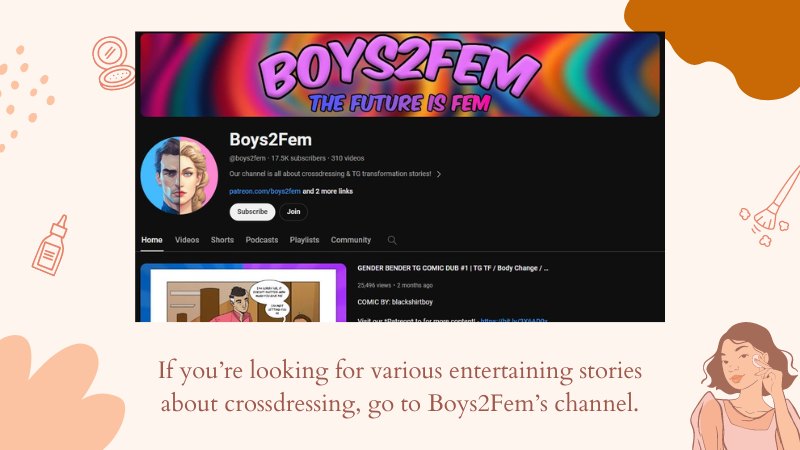If you’re looking for various entertaining stories about cross dressing, go to Boys2Fem’s channel.