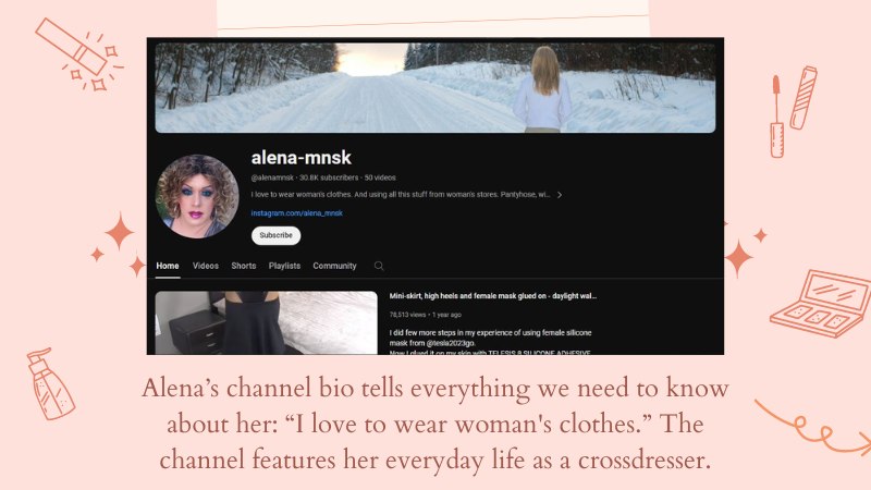 Alena’s channel bio tells everything we need to know about her: “I love to wear woman’s clothes.”