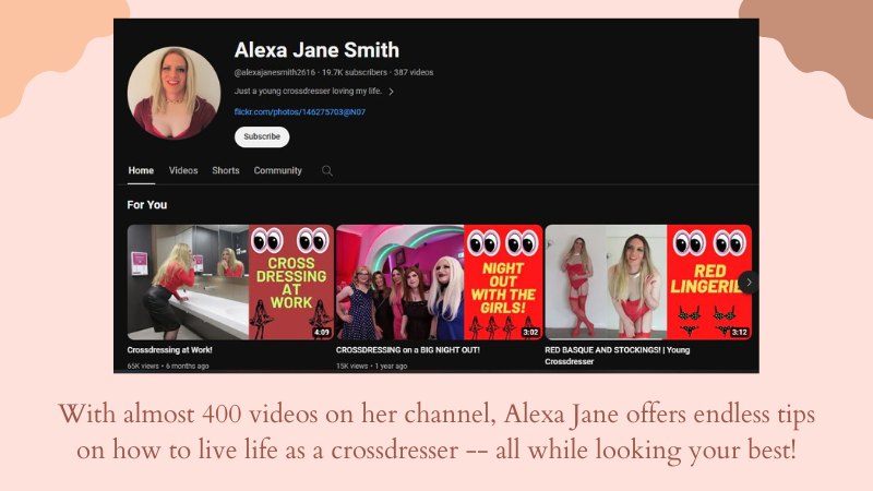 With almost 400 videos on her channel, Alexa Jane offers endless tips on how to live life as a cross dresser – all while looking your best!