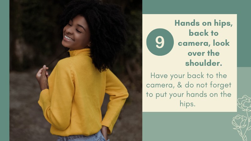 Some of the poses include: Hands-on hips, back to camera, look over the shoulder, stand sideways and turn to the side, and cross one leg over pose.