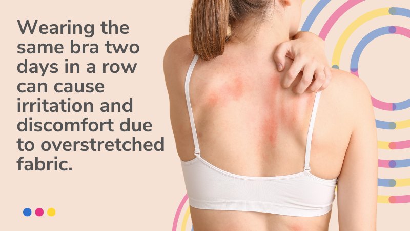 Your breasts need time to rest and recover, so switch your bras daily. Wearing the same bra two days in a row can cause irritation and discomfort due to overstretched fabric.