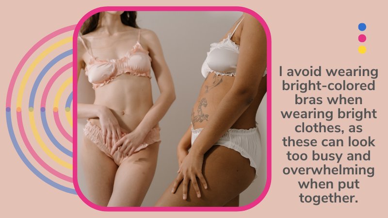 I avoid wearing bright-colored bras when wearing bright clothes, as these can look too busy and overwhelming when put together.