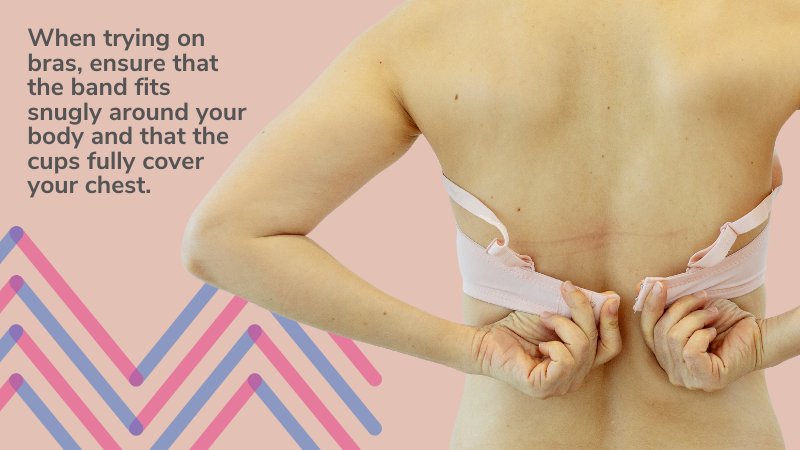 This is the key to having a comfortable and secure fit. When trying on bras, ensure that the band fits snugly around your body and that the cups fully cover your chest. Also, check to ensure that any underwire doesn’t poke into your skin and that the straps stay in place.