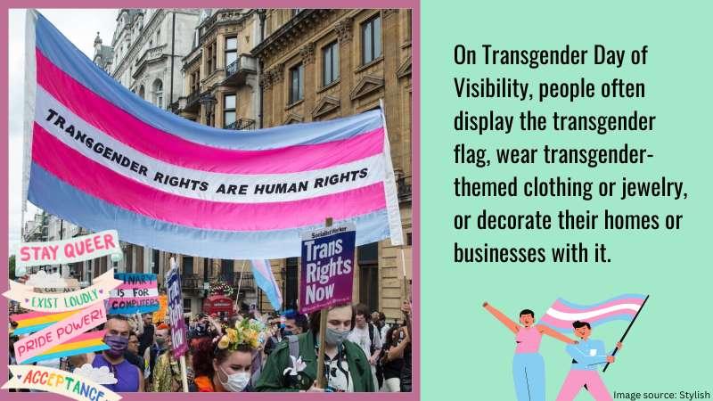 On Transgender Day of Visibility, people often display the transgender flag, wear transgender-themed clothing or jewelry, or decorate their homes or businesses with it. This day celebrates diversity, inclusion, and progress toward greater acceptance and support for transgender people. Also, several non-profit organizations use Transgender Day of Visibility to raise funds for their programs and services that support the transgender community. These campaigns help to provide resources and support for transgender people in need.