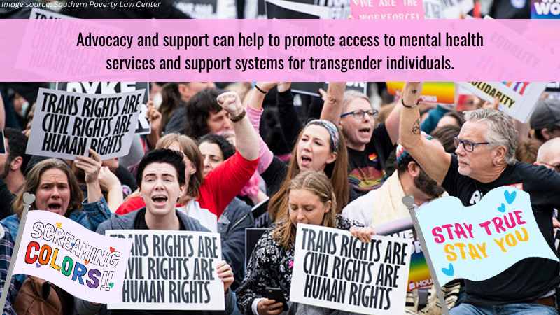 Advocacy and support can help to promote policies that ensure equitable access. Access to healthcare for transgender individuals is important. Also, transgender individuals have higher rates of mental health issues. Some of these include depression, anxiety, and suicidal ideation. Advocacy and support can help to promote access to mental health services and support systems for transgender individuals. Lastly, this helps celebrate diversity. Recognizing and celebrating the diversity of gender identity and expression is essential for promoting inclusion and creating a more accepting society. Advocacy and support can help to promote policies and practices that respect and honor the diversity of gender identity and expression.