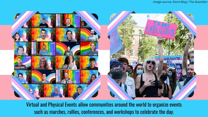 Transgender Day of Visibility is celebrated on March 31st every year to recognize and celebrate the achievements and resilience of transgender people. The day is also aimed at raising awareness about the challenges and discrimination faced by transgender people and promoting transgender rights. There are various ways in which the day is celebrated, some of which include virtual and physical events, social media campaigns, transgender flags and symbols, and fundraising campaigns. Virtual and Physical Events allow communities worldwide to organize marches, rallies, conferences, and workshops to celebrate the day. Due to the COVID-19 pandemic, many events may be held virtually, using online platforms to connect people.