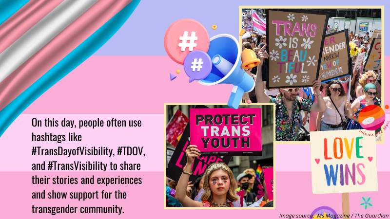 Social Media Campaigns use social media as a powerful tool used to raise awareness and show solidarity with the transgender community. On this day, people often use hashtags like #TransDayofVisibility, #TDOV, and #TransVisibility to share their stories and experiences and show support for the transgender community. Lastly, the transgender flag, designed by Monica Helms in 1999, is an important symbol used to represent the transgender community.