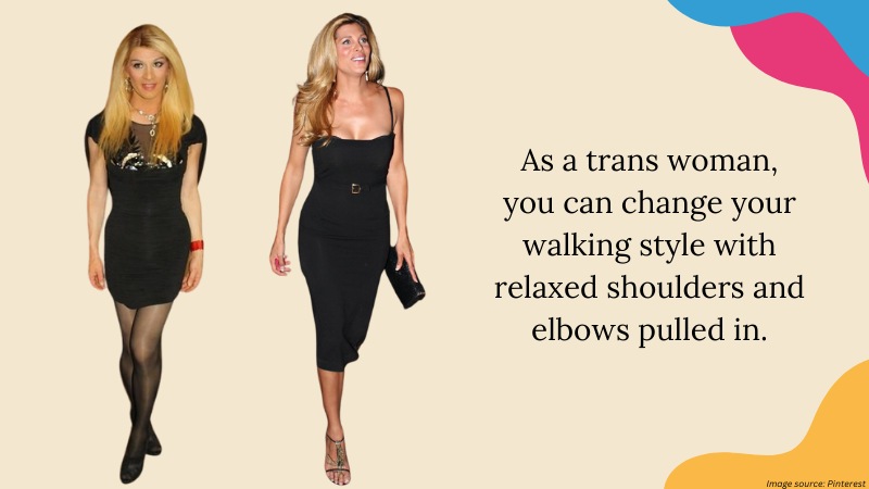 As a trans woman, you can change your walking style with relaxed shoulders and elbows pulled in.