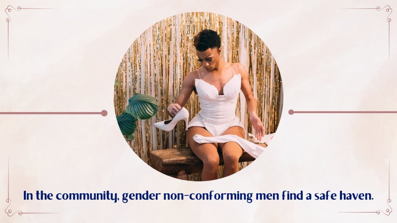 In the community, gender non-conforming men find a safe haven. By appearing as the opposite gender, many individuals find a way to fully express their feminine side, the taste, the extravagance, the style, the fashion that is otherwise forbidden to them to certain extents.