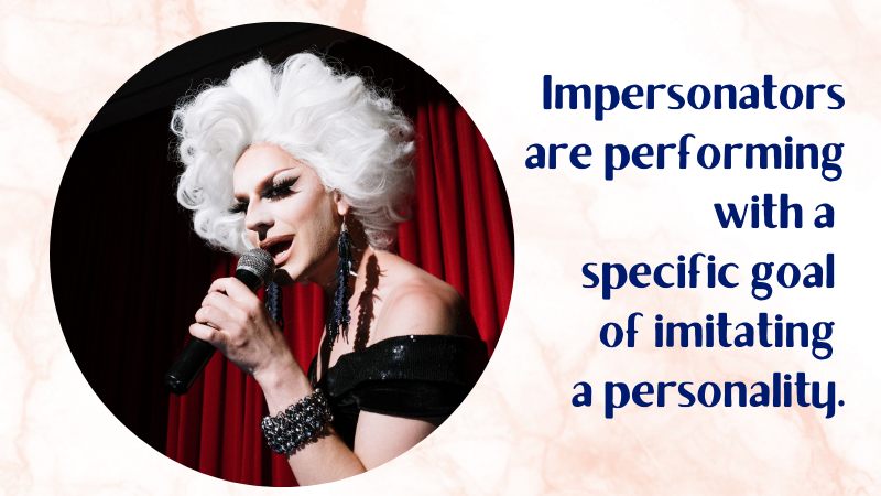 The art of impersonating is widely spread in the crossdressing community, especially on the drag scene. Impersonators perform to imitate a personality, either a historical figure, their surroundings, or a celebrity.