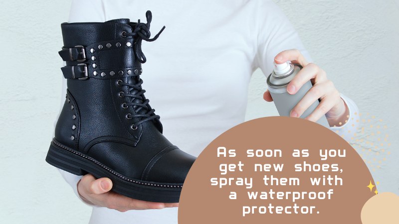 - As soon as you get new shoes, spray them with a waterproof protector. Choose the protector according to the fabric of the shoe, as they are not all the same. Unless the shoe is specifically designed for wearing in a wet and splashy situation, water is no friend of shoes.