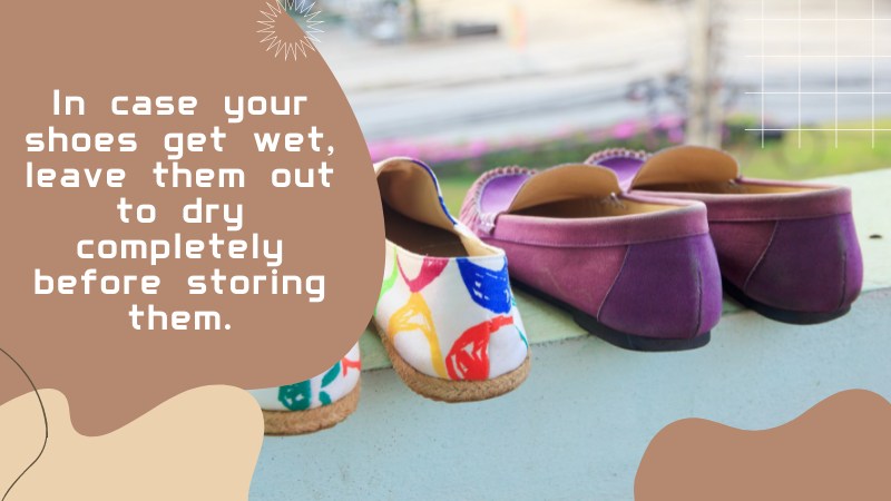 - In case your shoes get wet, leave them out to dry completely before storing them to prevent mold from appearing. Dry them out with a paper towel or similar, and leave them in a warm ambiance.