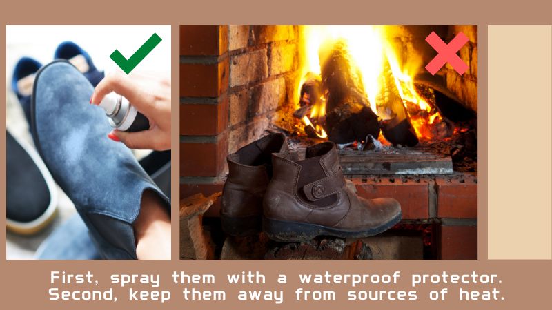 - If you are a velvet fan like me, two things will cover most bases. First, spray them with a waterproof protector. Of all the finishes you can choose from, velvet is the one that ruins the faster when in contact with water. Second, keep them away from sources of heat. If you think leaving your shoes next to a heater or a fire after they get wet is a good idea, let me tell you it’s not.
