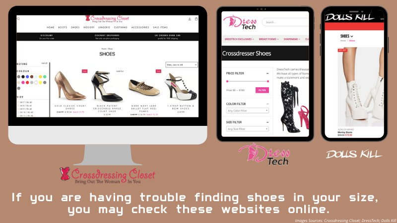 If you are having trouble finding shoes in your size, Crossdressing Closet has a wide variety of styles and sizes up to 17!