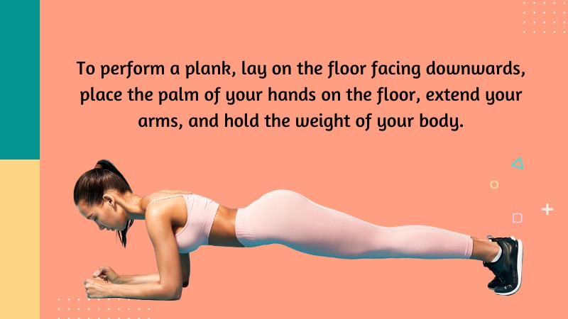 To perform a plank, lay on the floor facing downwards, place the palm of your hands on the floor, extend your arms, and hold the weight of your body. I like to end my workout by holding a plank as long as I can, reaching what is called fatigue. Continuing to work out after doing the plank can prove not only tiring but also ineffective. Here you can see how to perform a plank in case you were wondering!