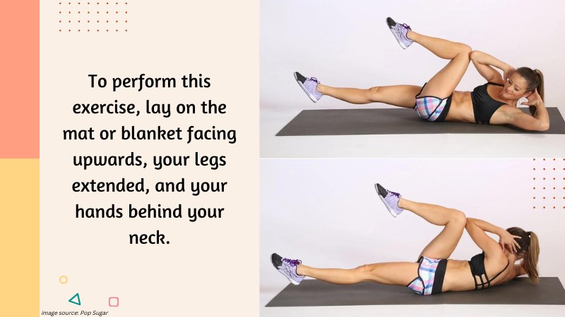 After the cardio and the previous exercise, we are ready to start working out our abs. This is one of the easiest exercises that target the core region. But that is because you are probably aiding your core region with the rest of your body without realizing it. Also, it works most of the muscles in the region, which makes it more of a light exercise. To perform this exercise, lay on the mat or blanket facing upwards, your legs extended, and your hands behind your neck. From this position, raise one leg and direct the knee towards your chest while your opposite elbow moves towards your knee. Alternate the movement of your knees and elbows with each rep. I suggest doing twenty or thirty reps and five sets in total. This exercise is third in line because it prepares your core region for the following ones, while not being too tiring on them. Here’s how to perform bicycle crunch!