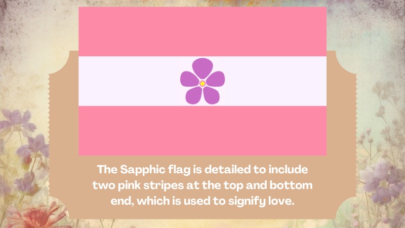 The Sapphic flag is detailed to include two pink stripes at the top and bottom end, which is used to signify love. It also comes with a lavender stripe, which is detonated to a flower.