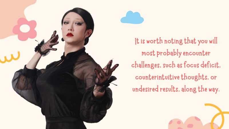It is worth noting that you will most probably encounter challenges, such as focus deficit, counterintuitive thoughts, or undesired results, along the way.