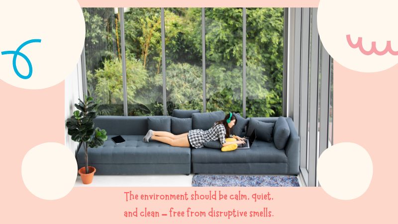 The environment should be calm, quiet, and clean – free from disruptive smells.