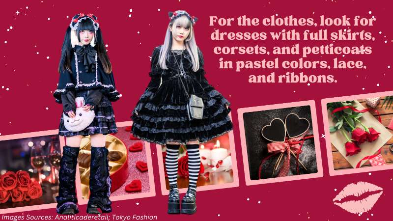 For the clothes, look for dresses with full skirts, corsets, and petticoats in pastel colors, lace, and ribbons. The iconic Lolita silhouette features a fitted bodice and a full, poofy skirt. Look for cute and girly shoes, such as Mary Jane, or knee-high socks with ribbon ties. Finish off the look with cute, feminine accessories such as bows, lace gloves, and a pastel handbag. For your hair, consider a cute hairstyle, such as twin braids or a classic bun with ribbons. Lastly, keep the makeup simple and sweet, with rosy cheeks, light eyeshadow, and subtle lip color.