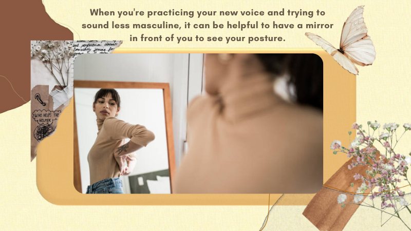 Finally, keep your mouth slightly open when talking. This will make it easier for your jaw muscles to relax and soften, leading to a more feminine tone. When you’re practicing your new voice and trying to sound less masculine, it can be helpful to have a mirror in front of you to see your posture. And remember, proper posture is important in every aspect of life—not just when you’re practicing your new feminine voice!