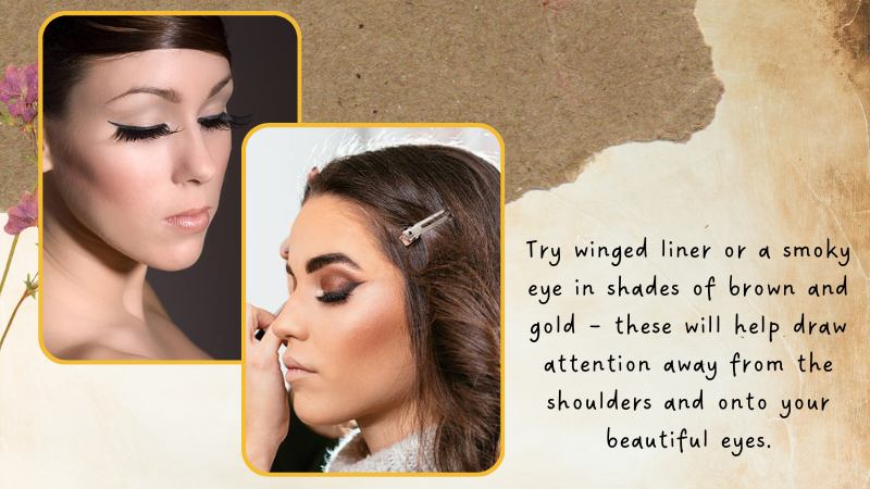 Additionally, eye makeup can make your face appear more delicate and feminine. Try winged liner or a smoky eye in shades of brown and gold – these will help draw attention away from the shoulders and onto your beautiful eyes. You can also opt for volumizing mascaras to give the illusion of larger eyes or use brighter colors like pinks and purples as accent colors around your eyes.