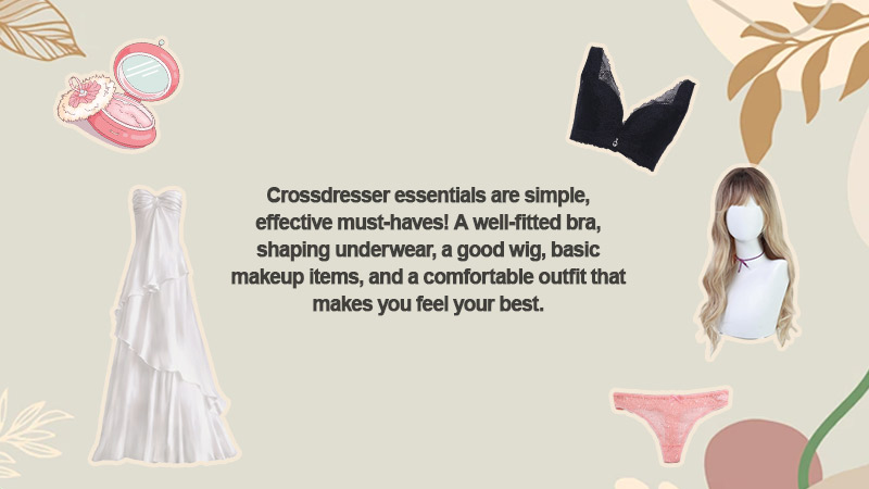 Crossdresser essentials are simple, effective must-haves! A well-fitted bra, shaping underwear, a good wig, basic makeup items, and a comfortable outfit that makes you feel your best.