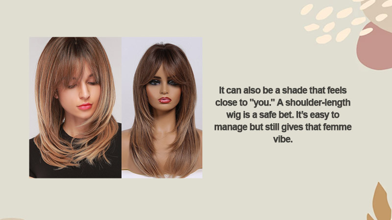 When selecting your first wig, it’s best to choose one that matches your natural hair color. It can also be a shade that feels close to “you.” A shoulder-length wig is a safe bet. It’s easy to manage, yet still exudes a feminine vibe.
