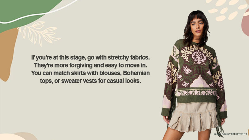 If you’re at this stage, go with stretchy fabrics. They’re more forgiving and easy to move in. You can pair skirts with blouses, Bohemian tops, or sweater vests for a casual look.